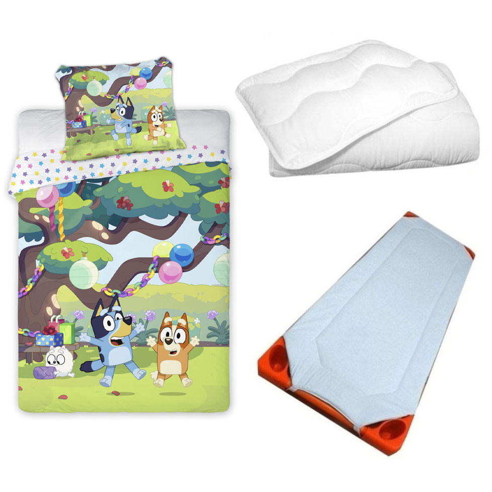 Bluey Garden Party gyerek, ovis ágyneműhuzat, derékalj és paplan/párna szett 100x135 cm 40x60 cm