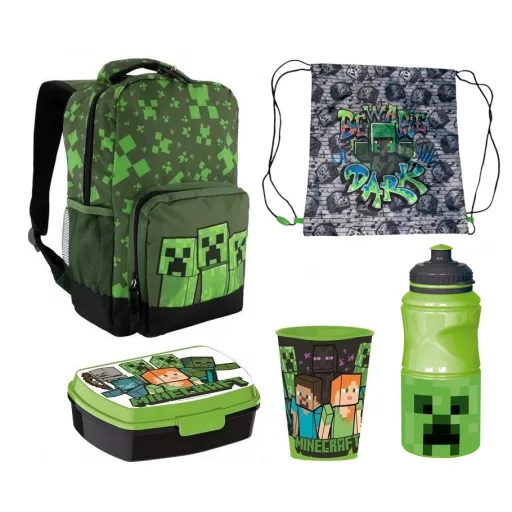 A Minecraftos táska első zsebe creeper mintás.